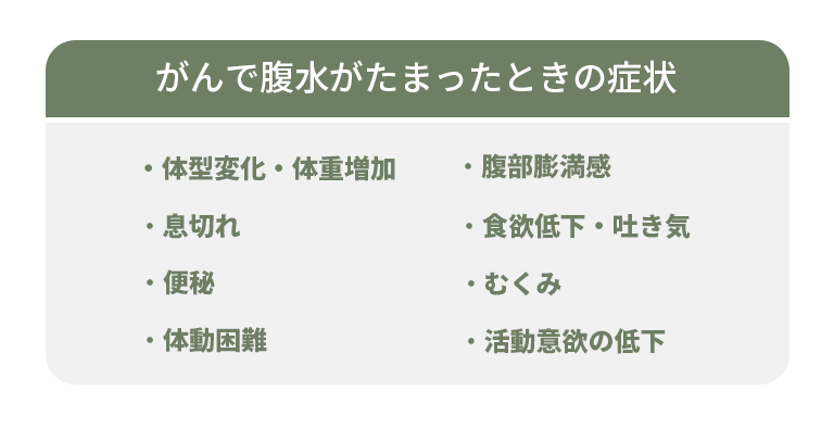 | 体動困難 | おなかの膨満や肺への圧迫などから、体を動かすのが難しくなり、横になって寝ることさえ困難になる場合もあります。 |
