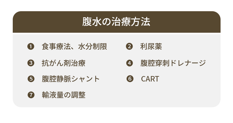 腹水の治療にはさまざまな選択肢があり、患者さまの状態に応じて最適な方法を選ぶことが可能です。代表的な治療法には以下の7つがあります。