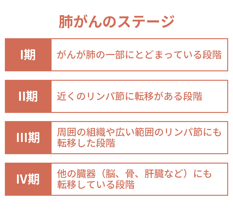 I期はがんが肺の一部にとどまっている段階、II期は近くのリンパ節に転移がある段階、III期は周囲の組織や広い範囲のリンパ節にも転移した段階、IV期は他の臓器(脳、骨、肝臓など)にも転移している段階です。