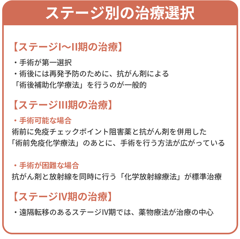 ステージⅠ〜Ⅱ期の場合、手術が第一選択です。術後には再発予防のために、抗がん剤による「術後補助化学療法」を行うのが一般的で、近年は免疫チェックポイント阻害薬(アテゾリズマブやペムブロリズマブなど)を術後に使用する選択肢も加わりました。手術が困難な場合(高齢、心肺機能低下など)には、放射線治療が有力な代替手段となります。