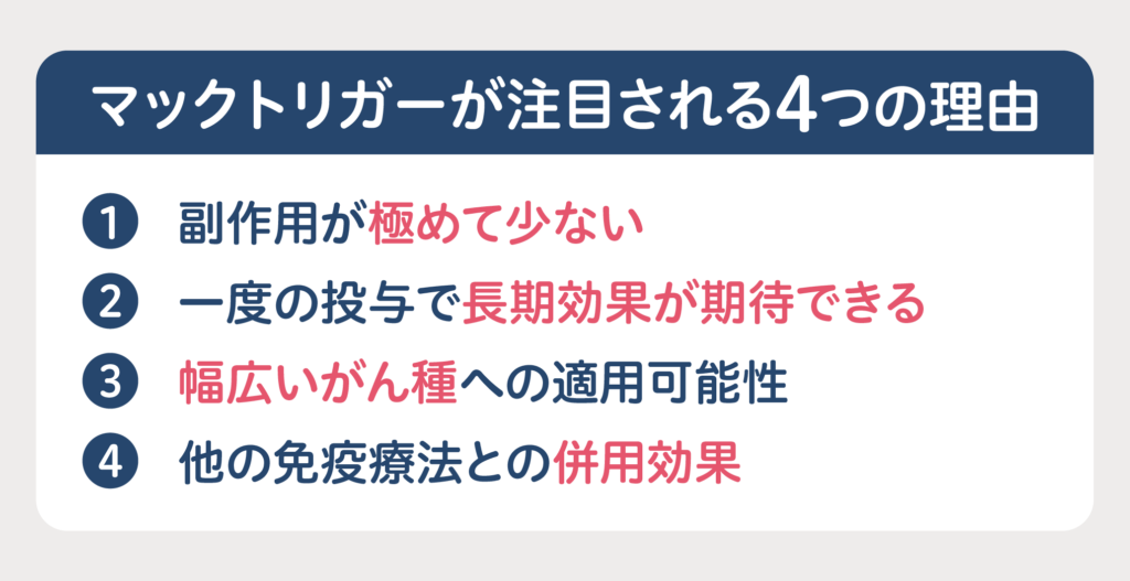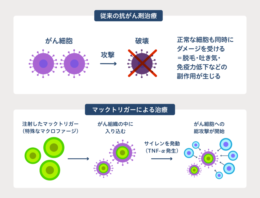 一方、マックトリガーはがん細胞を直接攻撃するのではなく、トリガーとして体内の免疫システムを活性化してがんに対抗します。そのため、健康な細胞への直接的な障害を抑えられる可能性があり、副作用を大きく軽減できることが期待されています。