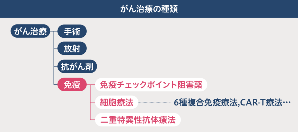そもそもがん治療には「外科手術」「化学療法(抗がん剤)」「放射線治療」という三大療法があり、近年これらに続く「第四の治療」として免疫療法が注目されています。