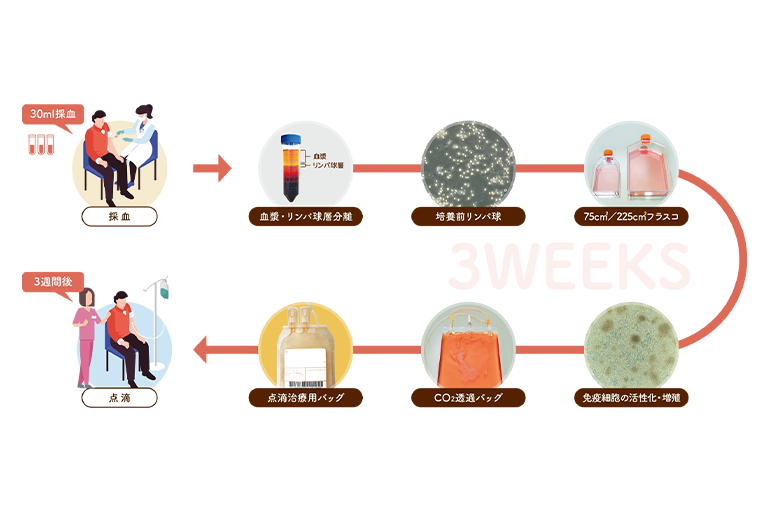 まず採血で免疫細胞を採取し、約3週間かけて培養・増殖させます。