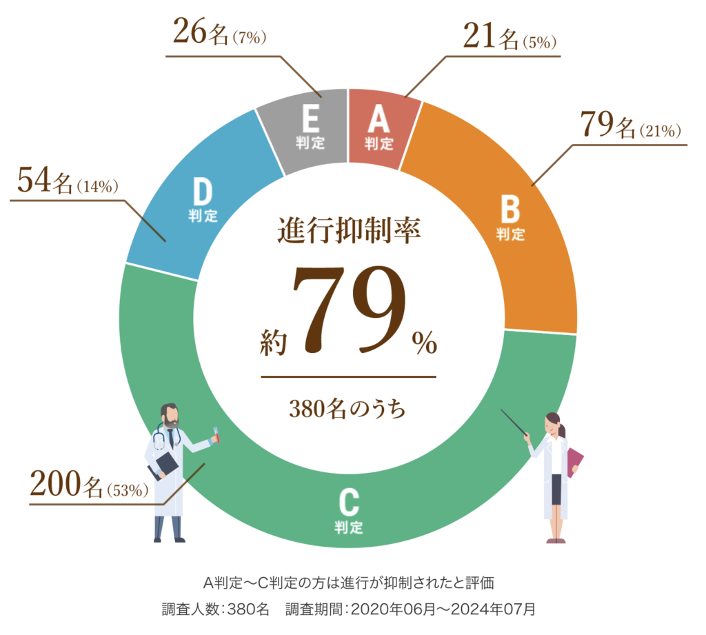6種複合免疫療法を6回(1クール)受けた380名の患者さまを対象に調査した結果、腫瘍の進行が抑制されたと評価された(A・B・C判定)患者さまの割合は約79%(300名)でした(調査期間:2020年6月〜2024年7月)。