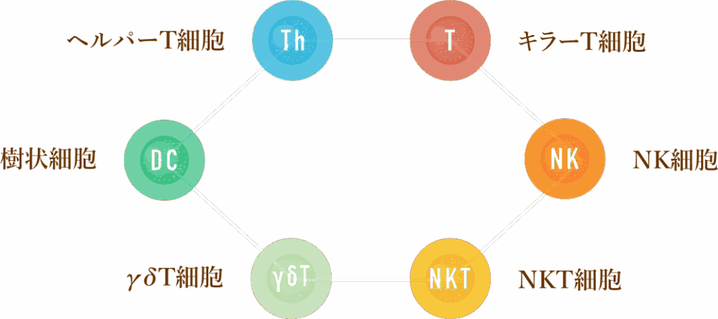使用する免疫細胞は、ヘルパーT細胞・キラーT細胞・NK細胞・NKT細胞・γδT細胞・樹状細胞の6種類です。