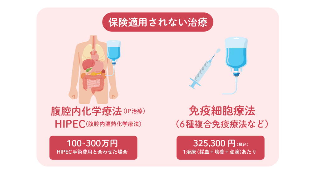 腹腔内化学療法(IP治療)・HIPEC(腹腔内温熱化学療法)は現時点で保険適用外であり、費用はすべて自己負担となります。