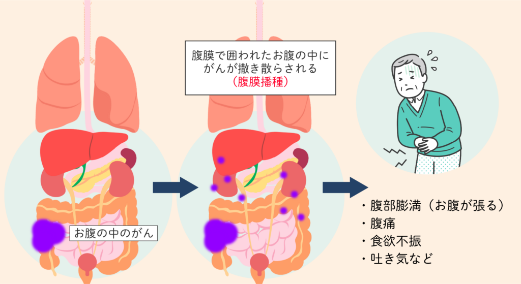 腹膜播種が起こると、胃や肝臓、腸などの表面でがんが進行するため、腹部膨満(お腹が張る)、腹痛、食欲不振、吐き気などの症状が引き起こされます。