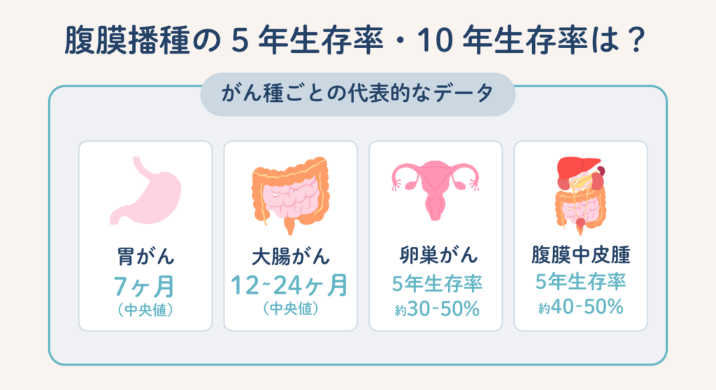 腹膜播種全体(がん種横断的)の5年生存率・10年生存率のデータは統一されたものがなく、がん種・治療法・播種の広がりによって大きく異なります。