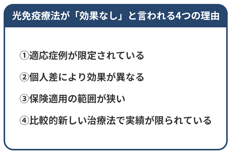光免疫療法が「効果なし」と言われる理由として、適応症例の限定、個人差による効果のばらつき、保険適用範囲の狭さ、実績の蓄積が不十分であることなどが挙げられます。これらの課題については、今後の研究開発により徐々に改善されていくことが期待されています。